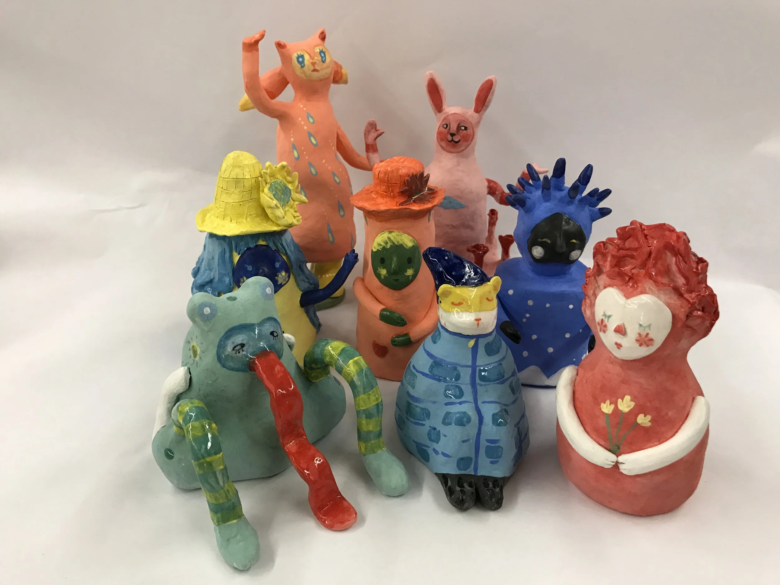 These are series of ceramic dolls under the theme of season and weather. Top row is in order of spring, summer, fall and winter. They are inspired by my family. Lower row is a further inspection of similar topic- weather. My friend told me I am like a big clear blue sky with a small dark cloud in the middle. It was intriguing for me how personality of a man can be described as weather. I chose three more weather such as sunny and raining at the same time, humid and damp, cold out and ready to hibernate and matched with animals that relates to the weather.